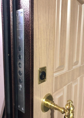 | Дверь: | имеет три наружные петли на опорных подшипниках диаметром 20 мм, что позволяет двери открываться на 180 градусов к стене, также два противосъёмных шипа диаметром 10 мм, которые предохраняют вскрытие двери путём срезания петель |